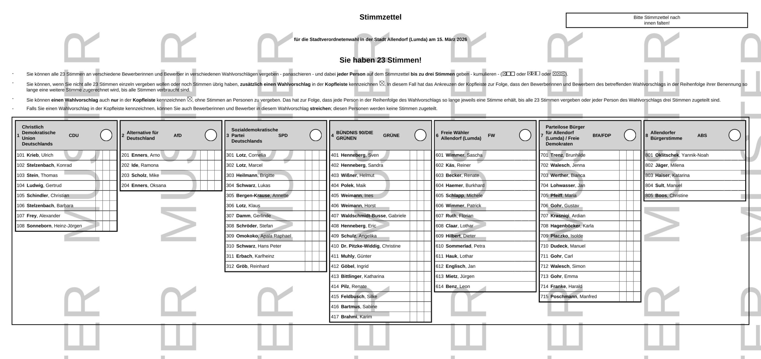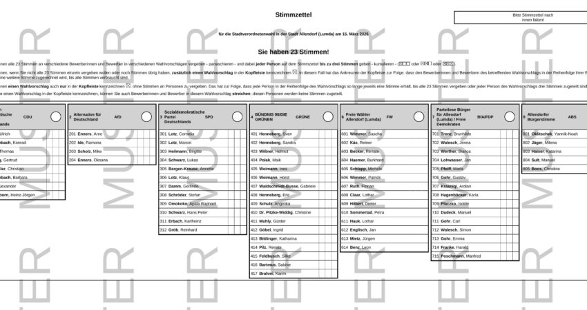 wir von Bündnis 90/Die Grünen Allendorf (Lumda) haben Ihnen online einen Musterstimmzettel als Bild zur Verfügung gestellt. So können Sie bereits jetzt sehen, welche Bewerberinnen und Bewerber für welche Partei oder Wählergruppe antreten.